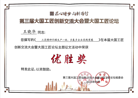 本次征文活动由大会组委会发起,共收到来自全国的征文 2463 篇,经专家评审、组委会复审复核,最终评选出一等奖 10 篇、二等奖 20 篇、三等奖 30 篇、优胜奖 50 篇。王晓华教师的论文围绕工匠精神核心主题,结合多氟多企业实践案例展开研究,以贴合主题的内容与规范的研究呈现,在众多作品中脱颖而出。